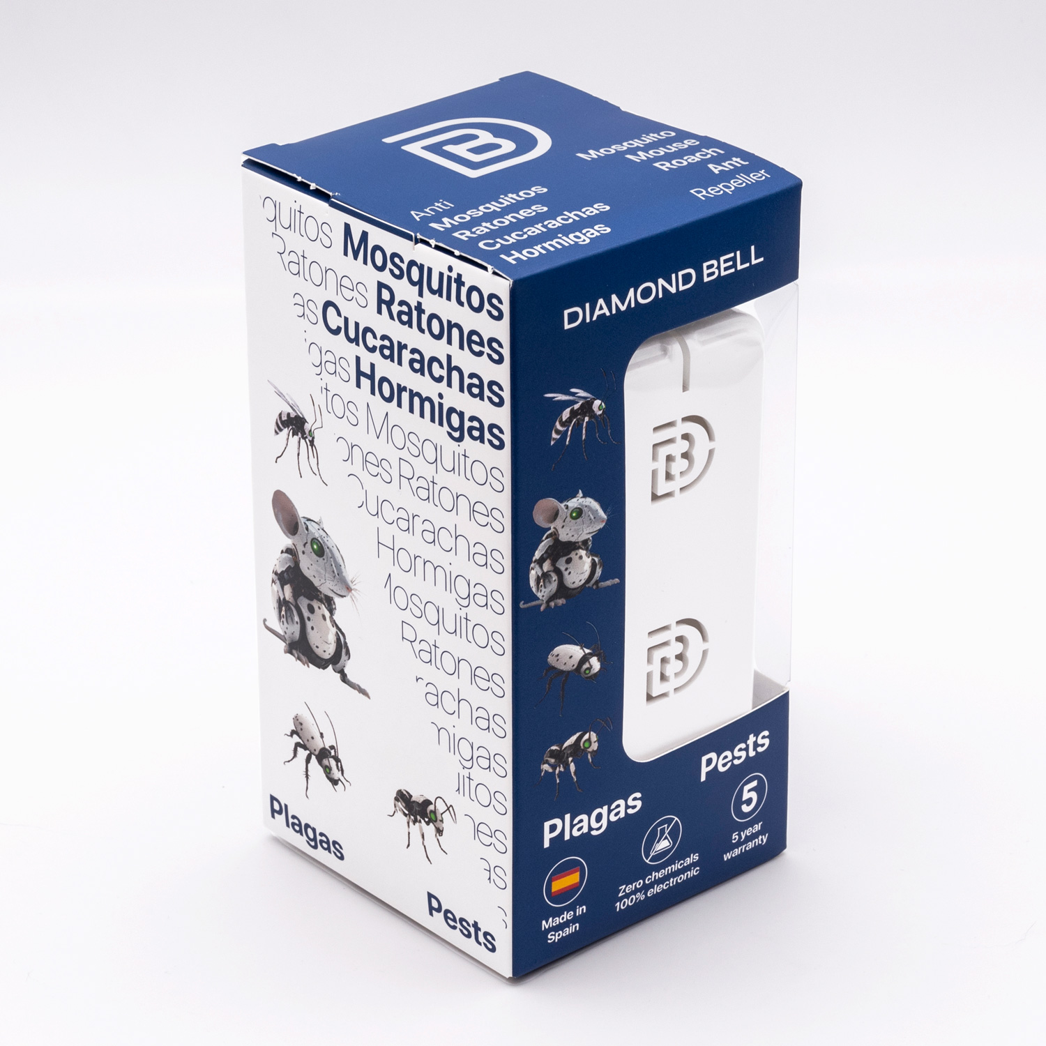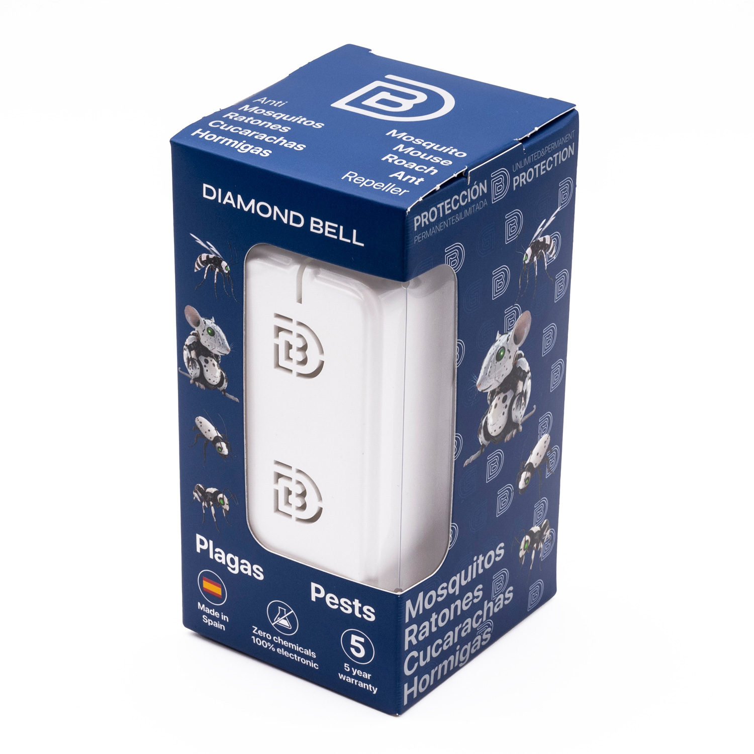 The Diamond Bell® DB-05 Pest Repeller uses ultrasound to protect the home from different types of pests, such as mice, roaches, and mosquitoes. It also uses DB electromagnetic technology to repel ants without using chemicals or pesticides. It is easy to install and safe for people and pets.